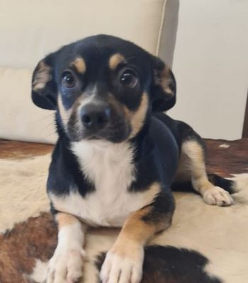 Zypern: Lucy ist eine junge Mischlingshündin, geboren im Oktober 2023, mit weiß-braun-schwarzem Fe…