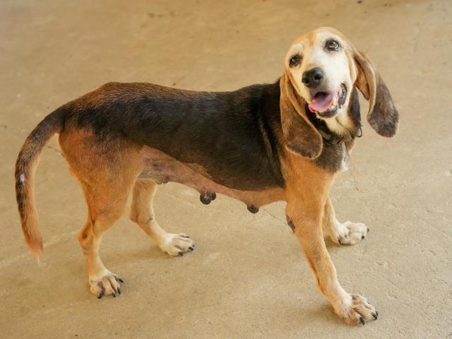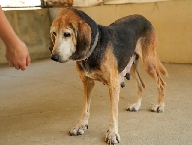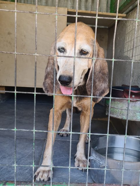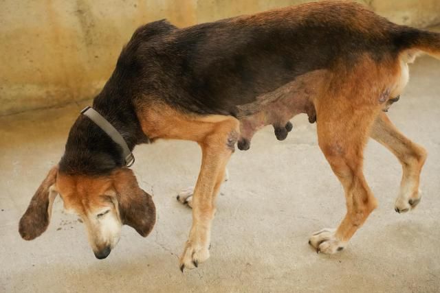 Kyproula ist etwa 11 Jahre alt und hat ihr bisheriges Leben wohl fast ausschließlich in einem Zwinger verbracht. Sie wurde jahrelang von einem Züchter ausgebeutet, musste einen Wurf nach dem anderen bekommen. Ihre langen, ausgeleierten Zitzen, die Liegeschwielen und die entzündeten Augen sind stumme Zeugen dieses Leids. Als sie für den Züchter „nicht mehr schön genug“ war, setzte er sie einfach aus. Durch ihren Mikrochip konnte man ihn finden – doch er wollte sie nicht zurück.