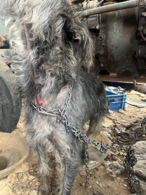 Die arme Hündin war an einer Kette festgemacht, die sich so stark verdreht hatte, dass sie sich kaum noch bewegen konnte. Wenn man sich vorstellt, dass sie ihre Welpen an diesem schmutzigen Ort zur Welt bringen musste, bleibt einem fast das Herz stehen.