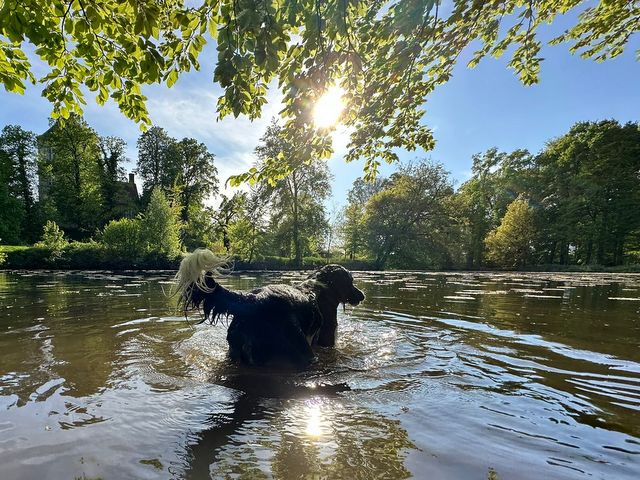 Spaniel-like liebt Cosmo nicht nur Vögel (besser gesagt, sie zu jagen), er begrüßt auch jeden Menschen und jeden Hund wie alte Freunde. Und er liebt Wasser, jede Pfütze wird zur Badewanne. Selbst im Winter war ihm keine Waldquelle zu kalt. Krank werden? Fehlanzeige. Lieber wurde das kurze Welpenfell durch eine warme Mähne ersetzt. Da Cosmo jetzt im Sommer auch richtig schwimmen gelernt hat, ist wirklich nichts mehr vor seiner Neugierde sicher. Draußen zu sein und die Nase einzusetzen ist für ihn das Allergrößte. Aber auch ins Büro kommt er gerne mit. Fährt entspannt U-Bahn und sogar Fahrstuhl. Oben angekommen warten schließlich Streicheleinheiten.