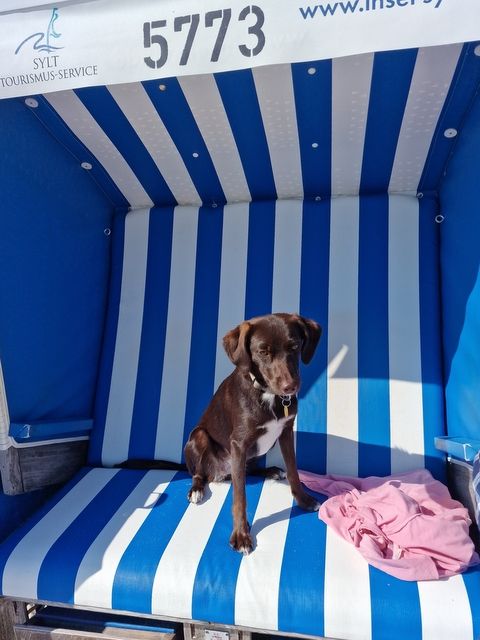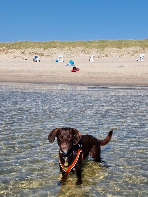 Am Anfang hab ich hier ganz schön gefroren, trotz Pulli. Mittlerweile genieße ich die tollen Strandspaziergänge auch bei Wind und Wetter. Die Nordsee ist mir noch ein bisschen unheimlich, obwohl mein Frauchen so gerne baden geht.