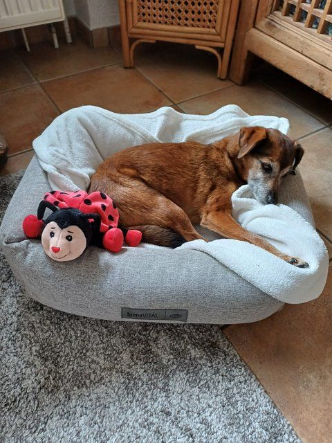In meinem neuen Zuhause ist fast alles erlaubt. Auch wenn ich ein weiches Bettchen für mich allein habe, darf ich aufs Sofa, wo wir immer ausgiebig kuscheln.
