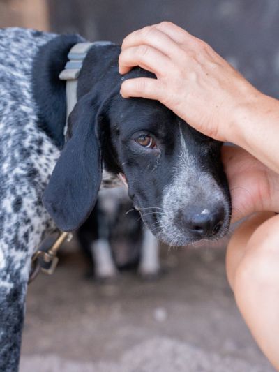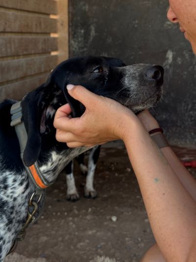 Beide Hunde sind sehr menschenfreundlich, lieben all die Aufmerksamkeit, die sie von den freiwilligen Helfern bekommen können, gehen gerne spazieren und verstehen sich auch gut mit allen anderen Hunden und teilen sich derzeit einen Käfig mit Marlon, einem anderen sehr freundlichen Pointer-Mix und einer anderen großen Hündin. Sie verstehen sich alle gut. Es ist so herzerwärmend, wie die beiden bei ihrer Ankunft aussahen und wie sie jetzt aussehen. Duke hatte ein wundes Bein, das beim Tierarzt behandelt wurde. Duke benimmt sich im Auto sehr gut, sitzt brav und ist ruhig. Der arme Kerl wurde inzwischen auch noch von einer Wespe gestochen und hatte ein geschwollenes Auge, aber auch das ist jetzt alles wieder verheilt.