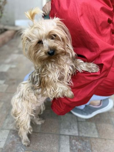 Während die Dame ihren Yorki-Freund Dandie eingefangen hatte
