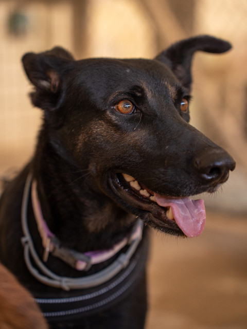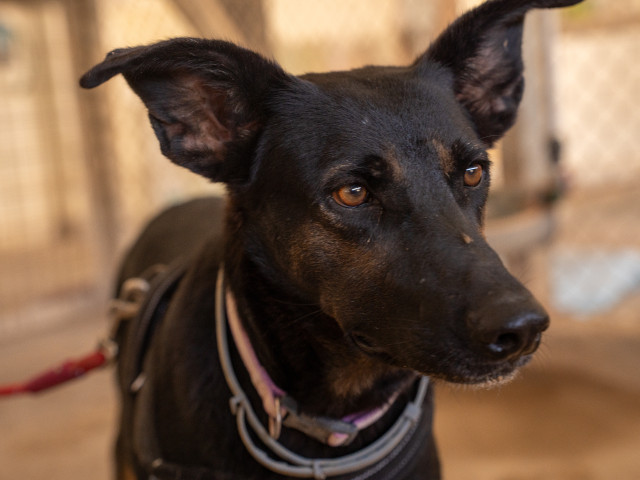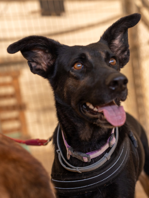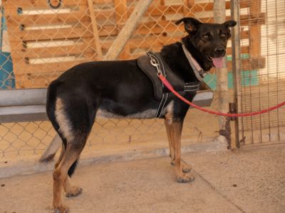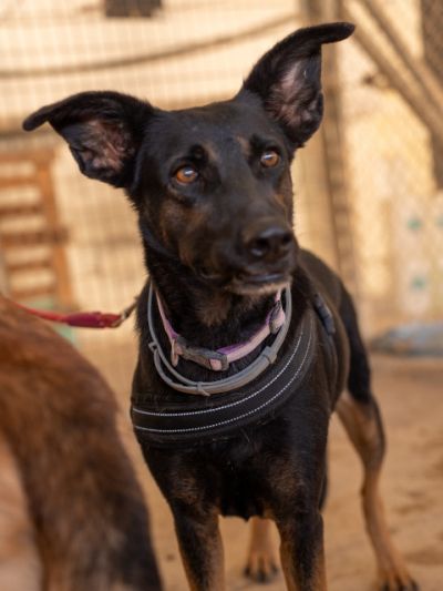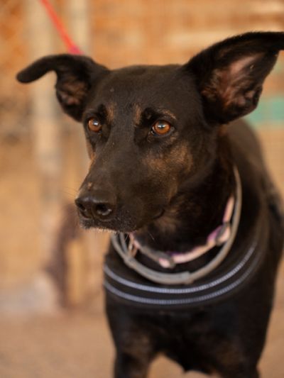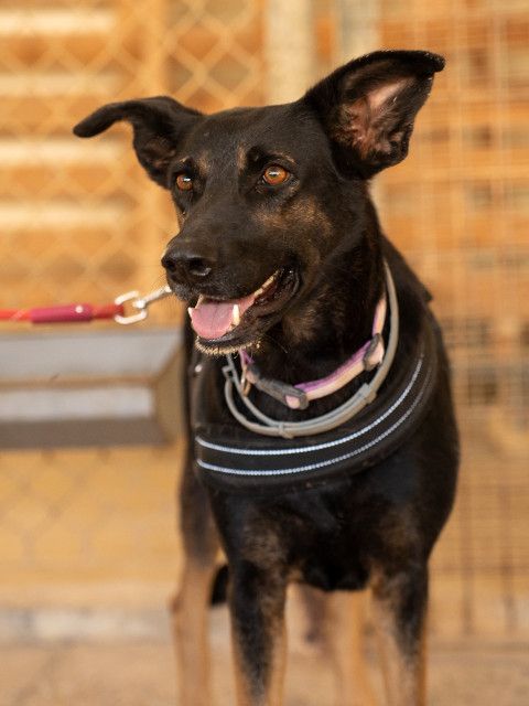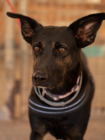 Lady ist ein ruhiger Hund, bellt nicht und ist sehr ängstlich. Wenn jemand, der ihr nicht geheuer ist, ihren Zwinger betritt, reagiert sie sofort und rennt nach draußen in Auslauf. Wenn man ihr folgt, rennt sie zurück in ihren Zwinger und setzt sich in ihr Bett. Dort kann man sie leicht streicheln, ihr das Geschirr anlegen und sie geht bereitwillig spazieren und läuft gut an der Leine. Sie ist schwarz-hellbraun und hat spitze, große Ohren.