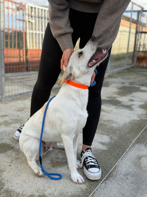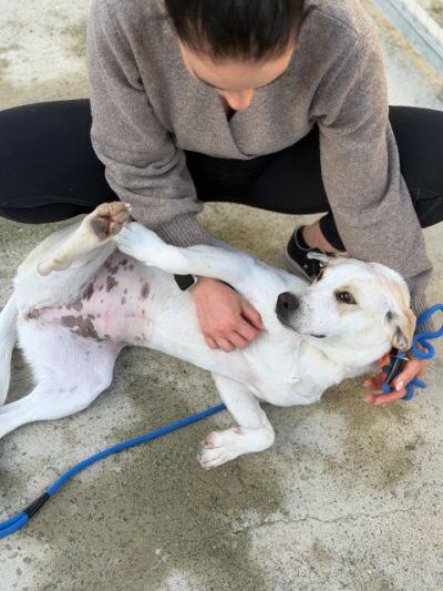 Die fröhliche Papaya wurde Ende Januar zusammen ihren drei Schwestern in einem Industriegebiet in der Nähe einer Baustelle gefunden. Trotz dieses schwierigen Starts ins Leben hat sie sich ihr großes Herz für Menschen bewahrt und zeigt sich heute als unglaublich menschenbezogene junge Hündin.