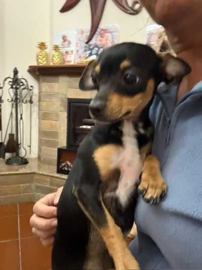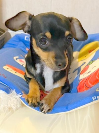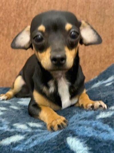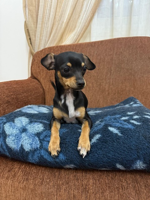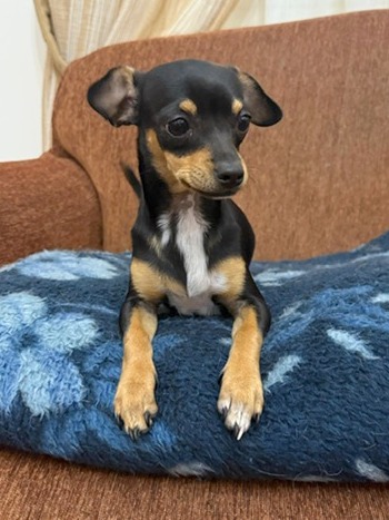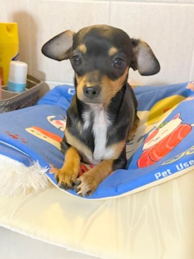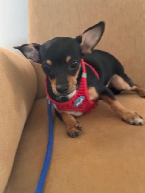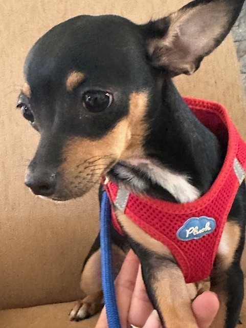 Sam ist ein Chihuahua-Mischling. Seine Mama ist eine weiße reinrassige Chihuahua-Hündin.