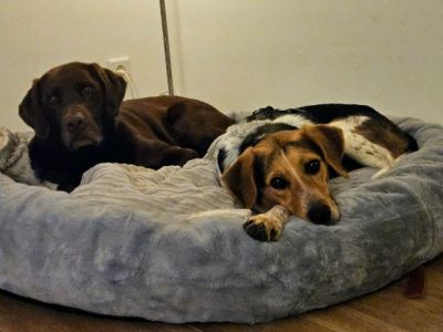 Ihren ersten Besuch bei Freunden hat Stella souverän gemeistert: ganz entspannt lag sie auf ihrer Decke und beobachtete das Geschehen ruhig. Auch das Anlegen von Halsband und Geschirr klappt problemlos.