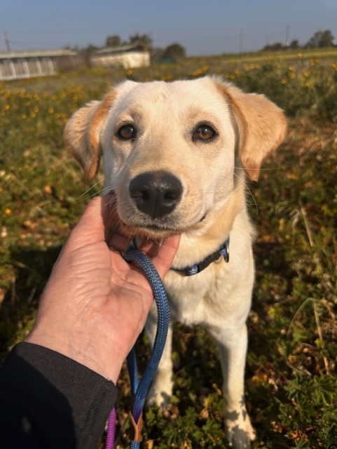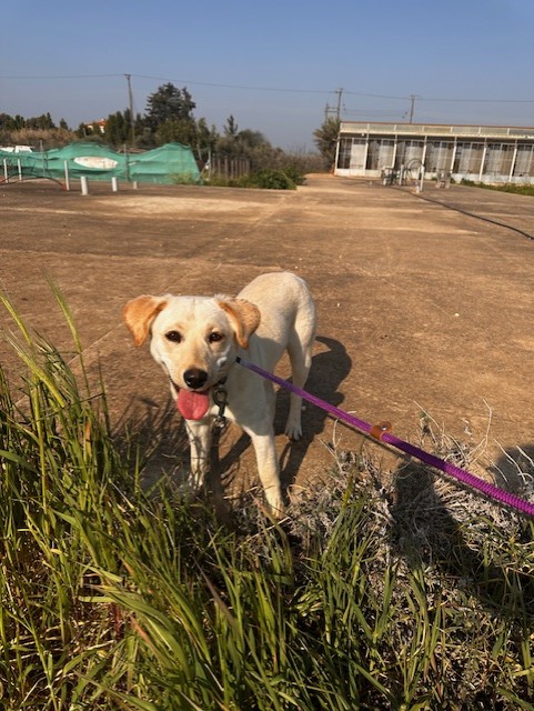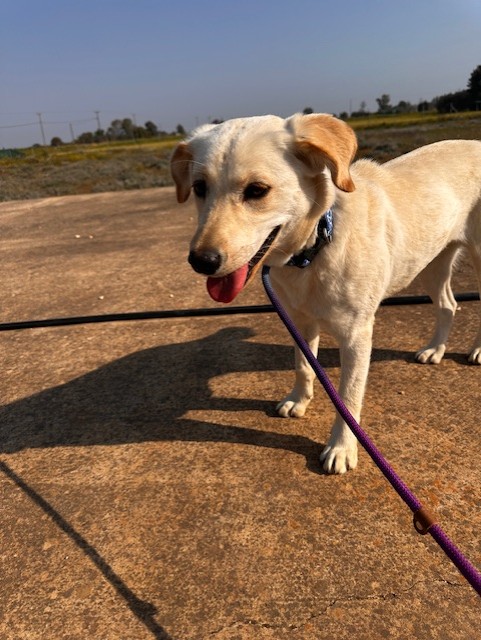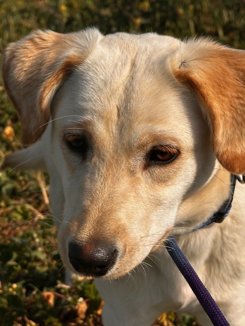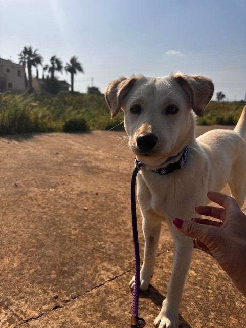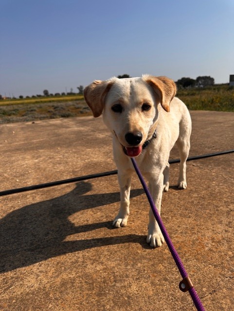 Allegra ist eine bezaubernde Mischlingshündin, die ca. 8 Monate alt und derzeit ungefähr 44 cm groß ist. Sie hat kurzes beige glänzendes Fell und einen absolut niedlichen Blick - wie kann man sie nicht direkt in sein Herz schließen? Wir vermuten, dass Bruni die Mutter von Allegra ist, da sich beide enorm ähnlich sehen und beide auf dem selben Feld außerhalb eines Wohngebietes gefunden wurden. Es war eine Herausforderung, Allegra zu fangen, denn sie war sehr schlau - aber zum Glück gelang es uns und sie ist nun seit kurzem bei unserer lieben Lorraine. Dort durfte sie zum allerersten Mal die Liebe und Fürsorge der Menschen spüren. Am Anfang zeigte sie sich ängstlich und skeptisch, was jedoch vollkommen normal ist, da sie vorher kaum menschlichen Kontakt hatte.