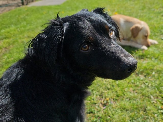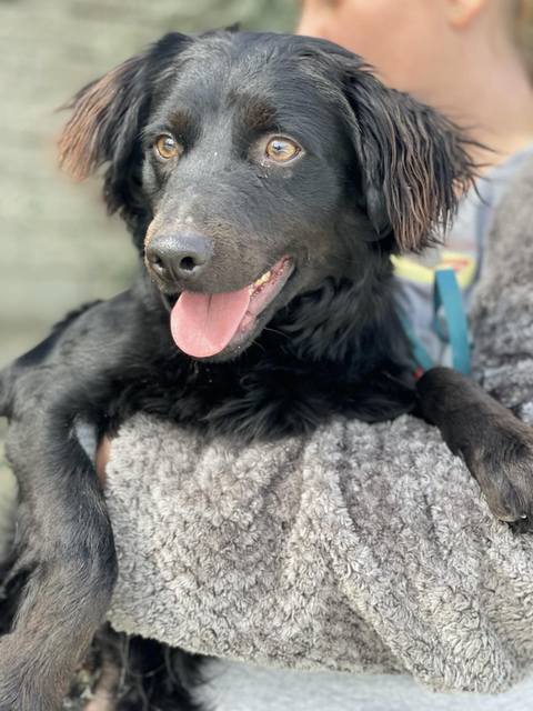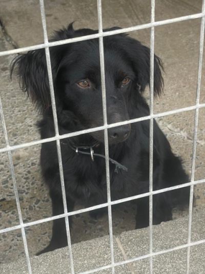 Boomer hat sehr viel von einem Spaniel. Er hat eine kurze Rute und ein sehr schönes welliges Haarkleid. Auf den Fotos ist er noch ziemlich schmutzig.