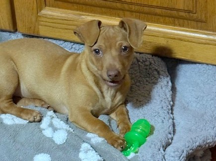 Coco ist eine süße Welpin, die sich jetzt freut, dass es Spielzeug und regelmäßig Futter für sie gibt .