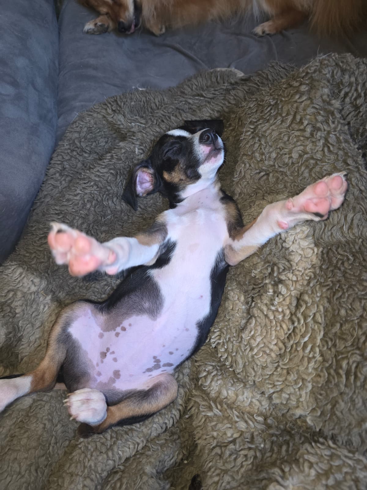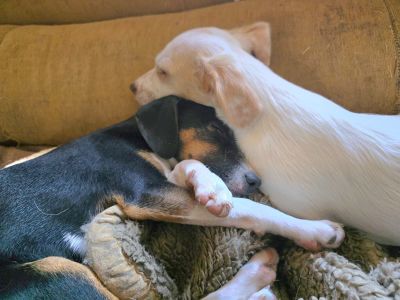 Geschichte: Am selben Tag, als ich Rally abholen wollte, schrieb mir ein Mädchen, sie habe unter einer Parkbank einen kleinen Welpen gefunden. Ich dachte, es wäre gut für Rally, einen Spielkameraden seiner Größe zu haben. Lovi war kleiner als Rally, jetzt ist sie mit ihren langen Beinen größer.