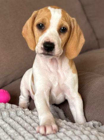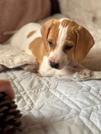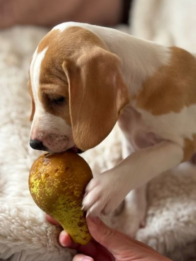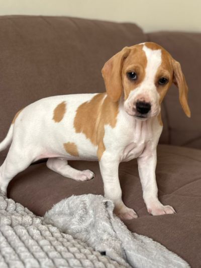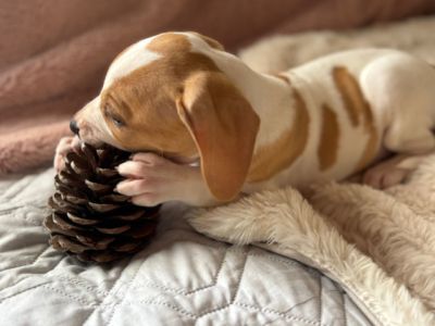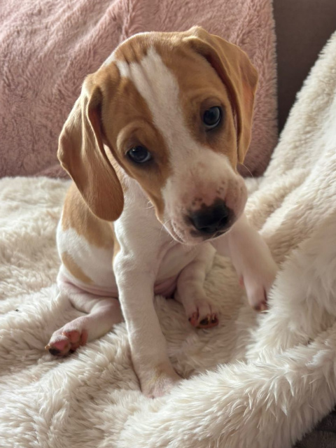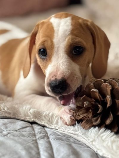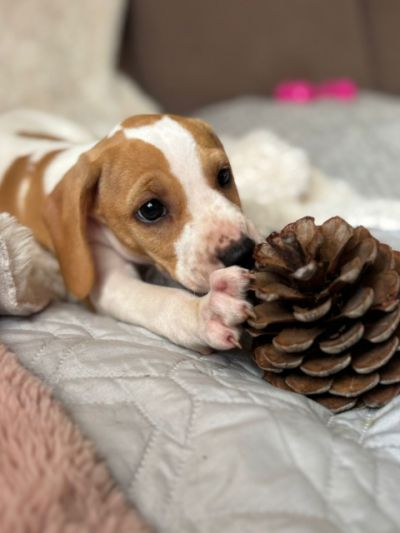 Eine fröhliche, neugierige und süße kleine Hündin, die es liebt zu spielen, zu snacken und allen um sich herum ein Lächeln ins Gesicht zu zaubern.