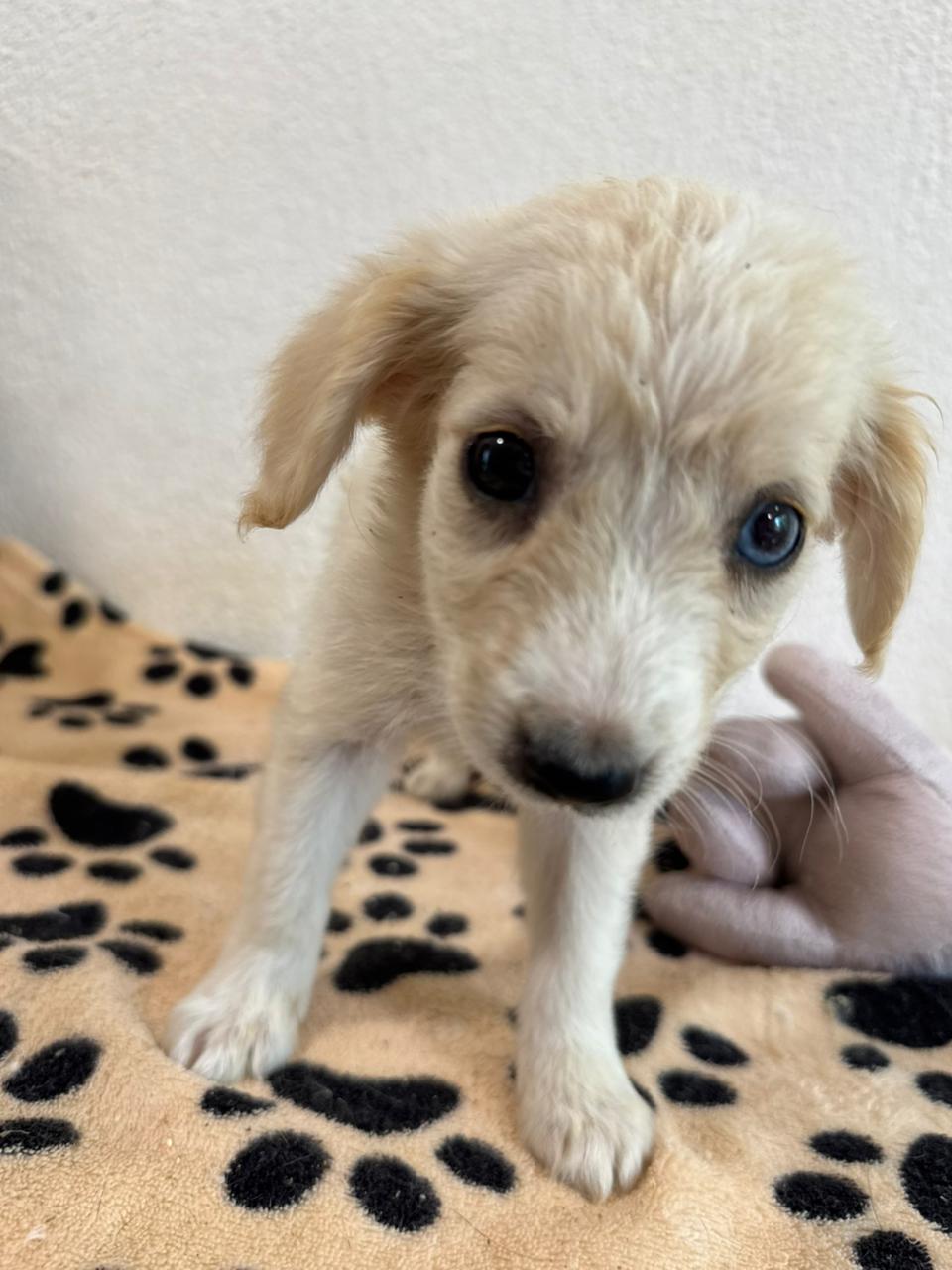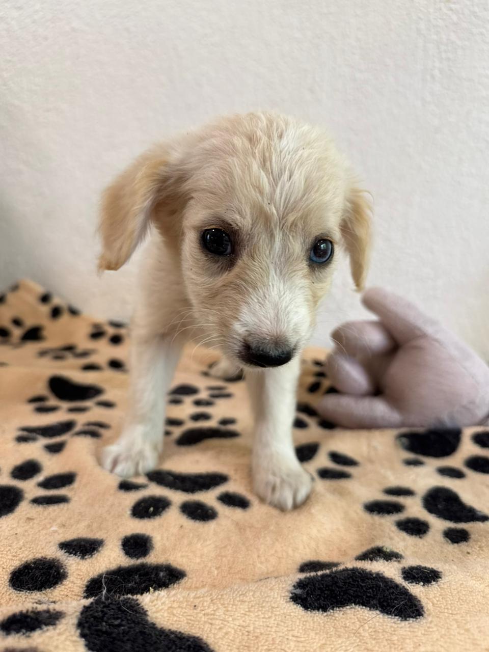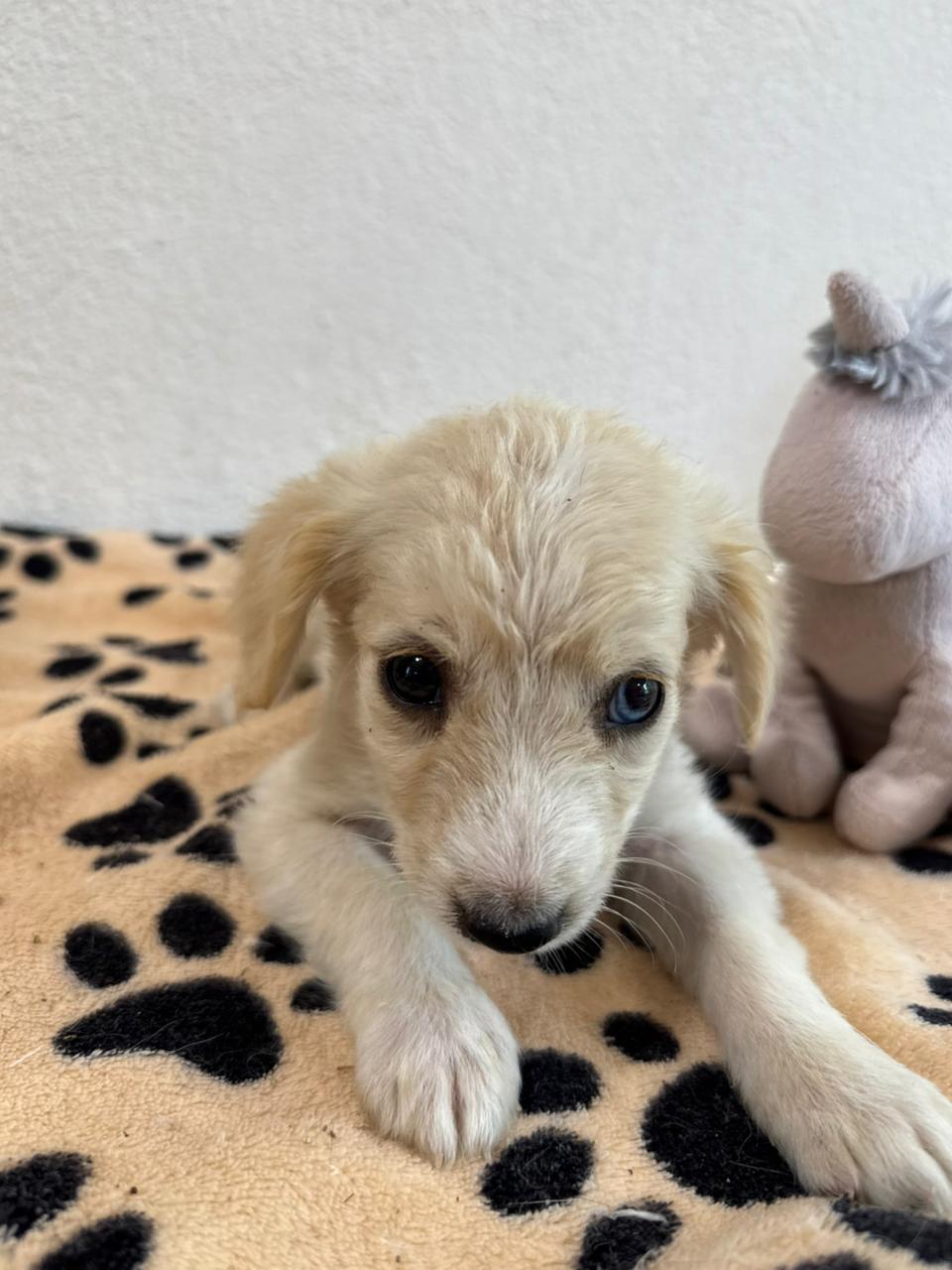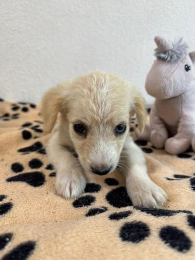 Alle Welpen haben unterschiedlich gefärbte Augen, Melias Augen sind unterschiedlich, eins ist braun, das andere blau.