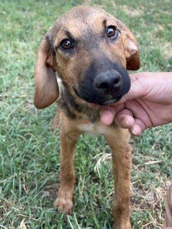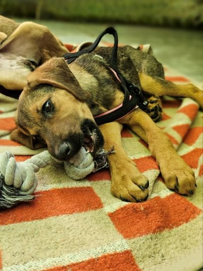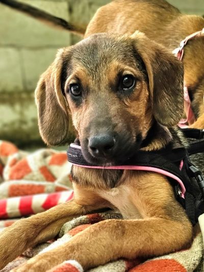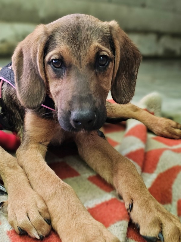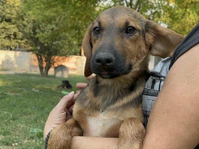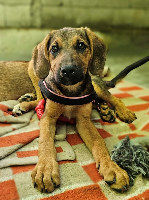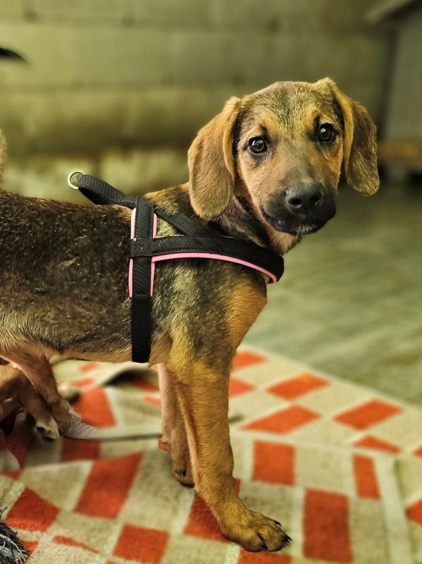 Nadia, eine junge Hündin, die ab Mitte Juli ausreisen kann. Sie ist ein riesen Schmusefan. Sie schmilzt dahin, wenn man sie streichelt. Am liebsten spielt sie mit ihren beiden Schwester. Dabei rangeln und toben sie herum, bis sie total müde einfach einschlafen, da wo sie gerade sind. Man könnte ihnen den ganzen Tag in ihrem Spiel zusehen. Nadia ist bereits an ein Halsband und an ein Geschirr gewöhnt. Es macht ihr nichts aus, wenn unsere Tierschützerin es anlegt.