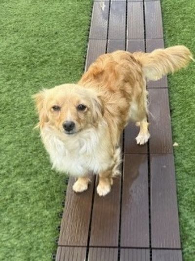 Ruby ist eine junge, goldfarbene Mischlingshündin, die stark an einen Kokoni‑Mix erinnert: zierlich, weich, freundlich und mit diesem typisch warmen, sanften Ausdruck. Ihr flauschiges Fell, die runden, liebevollen Augen und ihre kompakte Größe machen sie zu einer unglaublich süßen kleinen Begleiterin.