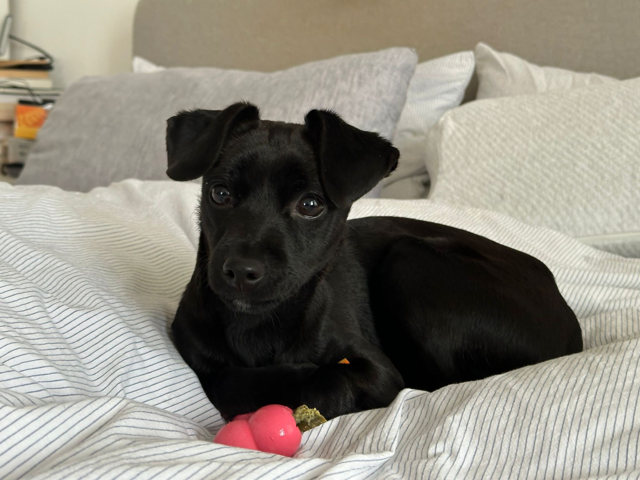 Er liebt Käse, Karotten und kleine Snacks neben seinen drei täglichen Welpenmahlzeiten. Er ist fast stubenrein und beginnt bereits, sich bemerkbar zu machen, wenn er raus muss. Katzen gegenüber zeigt er sich neugierig, aber respektvoll und wahrt ihren Raum. Kindern begegnet er freundlich und vorsichtig, insgesamt sehr behutsam.