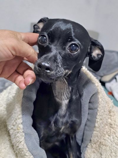 Suzi ist eine elegante Pinschermix-Hündin. Sie hatte ein Zuhause, in dem man jedoch kein Interesse an ihr hatte. Viki wurde darüber informiert, dass sie die Hündin sofort abholen müsse, oder man lege sie an eine Kette im Garten. Durch die eisigen Temperaturen würde die zarte Hündin das nicht lange überleben. Viki holte sie sofort und nahm sie mit zu sich nach Hause.