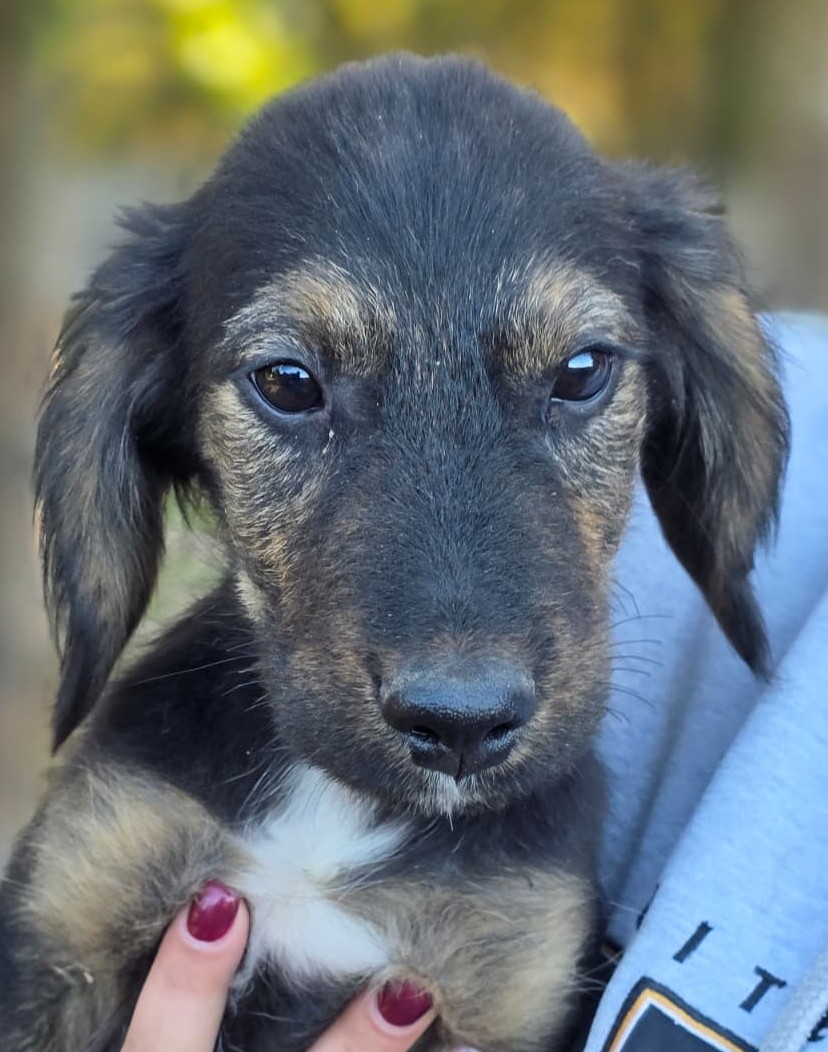 Er ist ein sehr unauffälliger kleiner Welpe mit den süßesten langen Ohren.