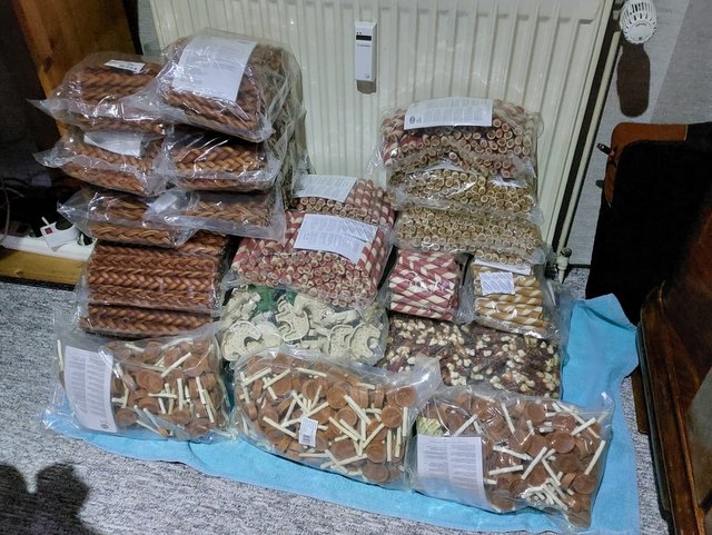 Aber jetzt nochmal zu der Firma Trixie und der tollen Mitarbeiterin Svenja Boldt. Wir haben 4 große Pakete bekommen. Es waren 90 Kilo Leckerchen und 24 Halsbänder. Ein ganz großes DANKESCHÖN im Namen der Fellnasen.