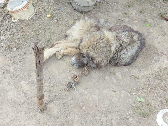 Funda war seit Welpenalter an, mit einer dicken Eisenkette und einem dicken Tau gefesselt.