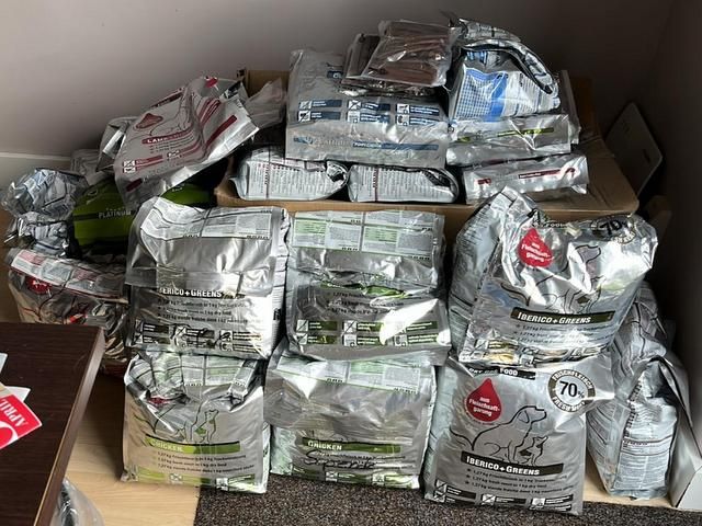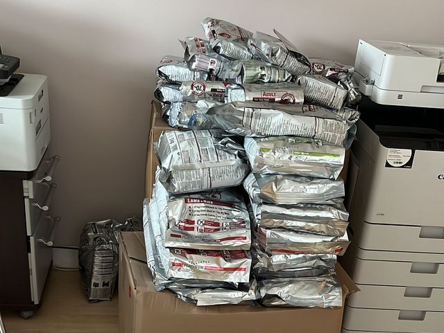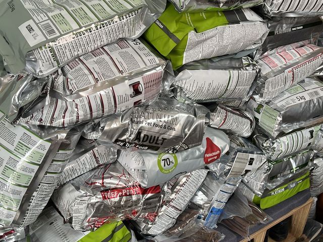 So sehen 400kg Hundefutter aus - Falls Sie also jemanden kennen, der eine nette Sachbearbeiterin bei einem Hundefutterhersteller kennt und bereit wäre, etwas zu spenden, melden Sie sich bitte. Denn solche großen Mengen können die Kollegen in den Stationen sehr gut gebrauchen. Hundefutter ist teuer und wir freuen uns immer sehr, wenn wir unterstützen können.