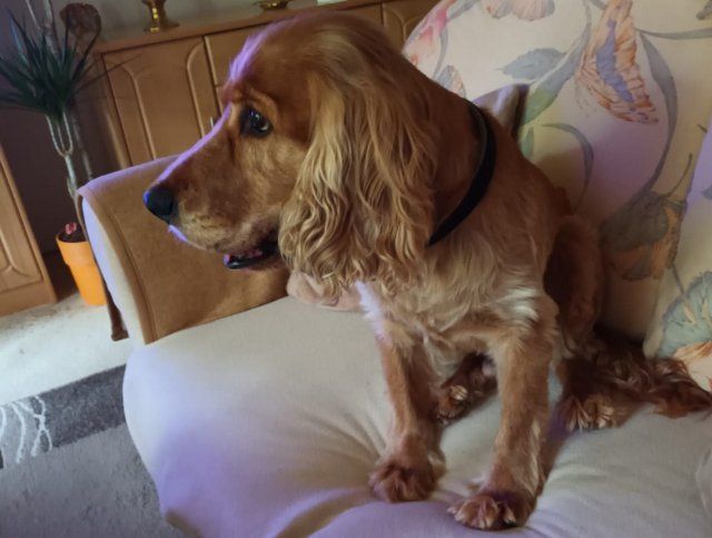 Jamie ist ein bildschöner reinrassiger blonder Cockerspaniel, der ein bisschen größer geraten und dazu recht stürmisch ist.