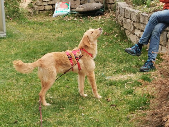 Alles ist neu und muss nun erst einmal erkundet werden. Der Garten mit dem Rasen, überall riecht es anders und die Menschen sind auch noch unbekannt - aber so lieb mit ihr und lecker Futter gibt es auch.