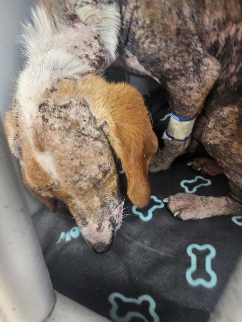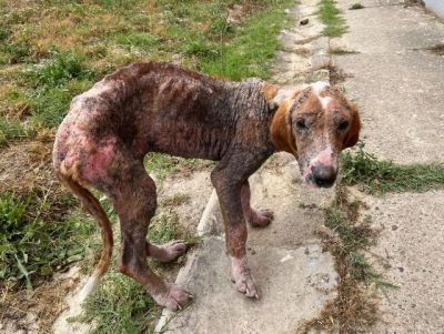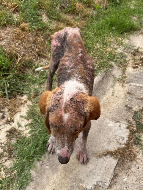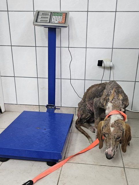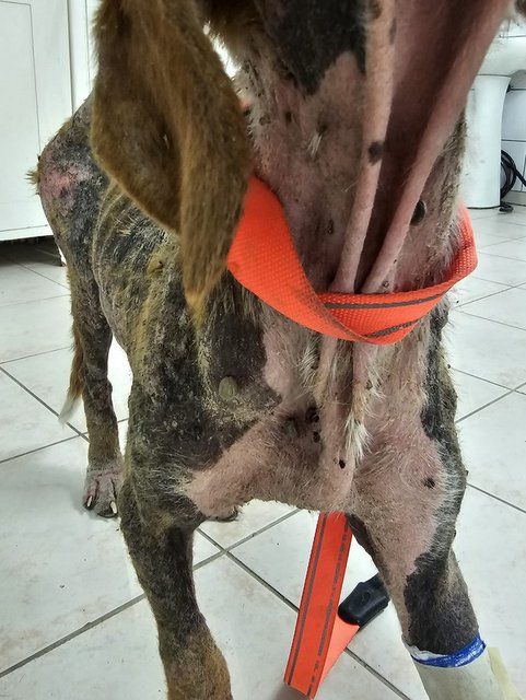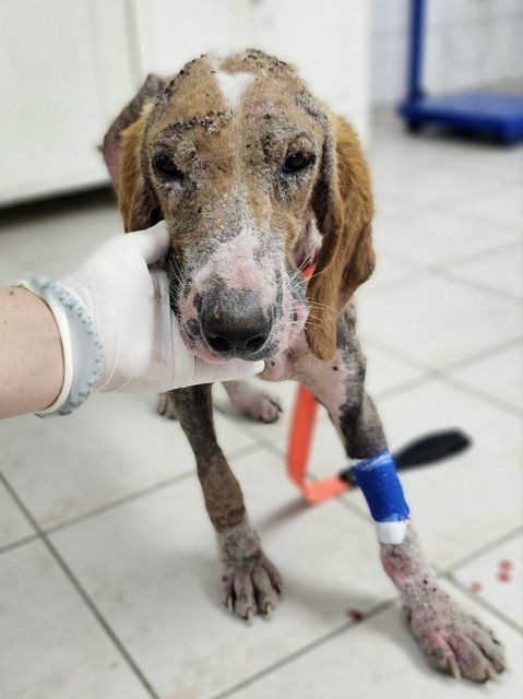 Vernachlässigt, ausgesetzt, fast verhungert und von der Sarcoptesmilbe aufgefressen und unter extremen Juckreiz leidend, so fand Viki diese arme geschundene Hündin.