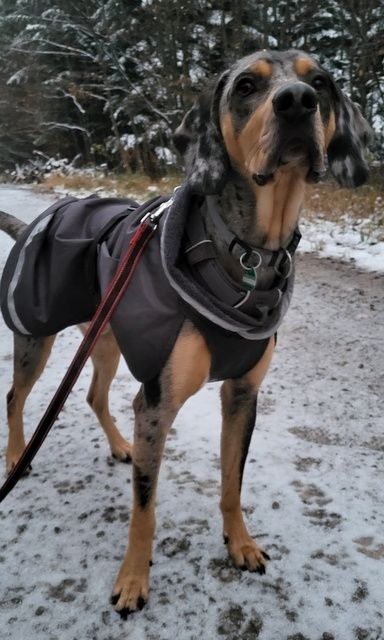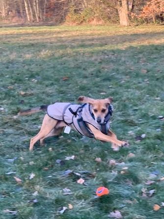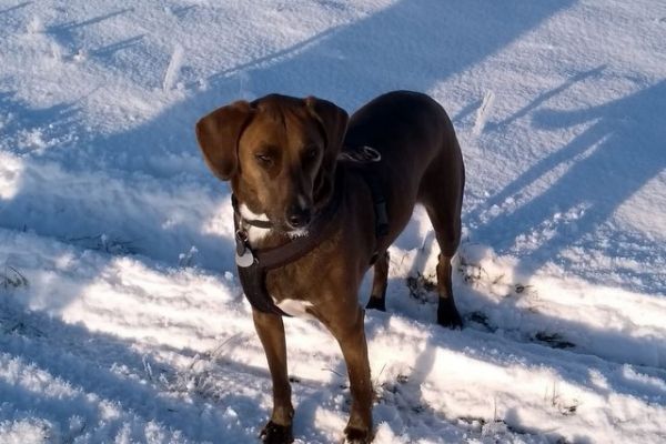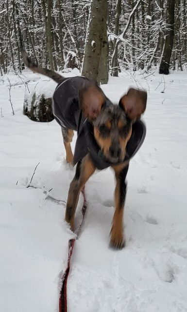 Mika ex Walker kommt aus Nordmazedonien und liebt den Schnee. Wenn er ohne Leine auf der Koppel rennen und flitzen kann, gibt er richtig Gas und pflügt mit der Nase durch den weichen Pulverschnee.