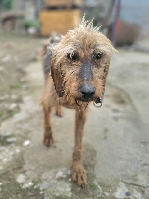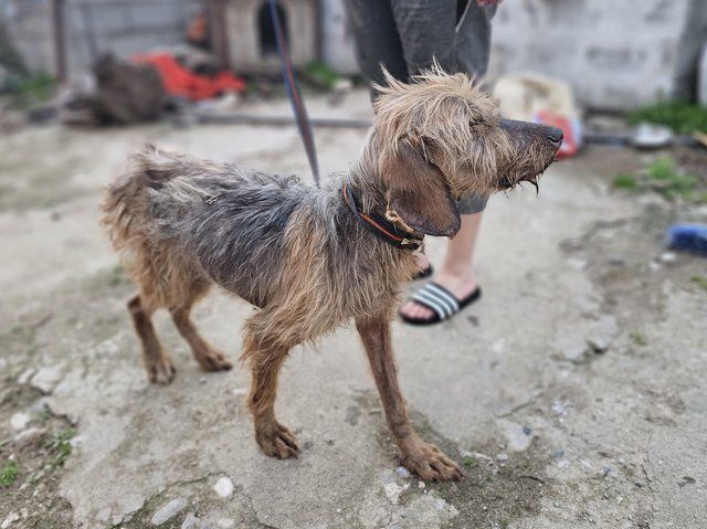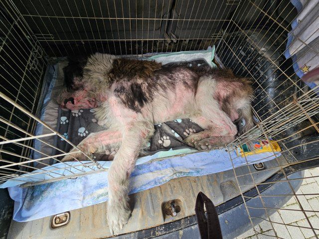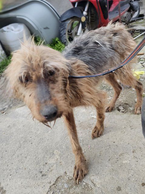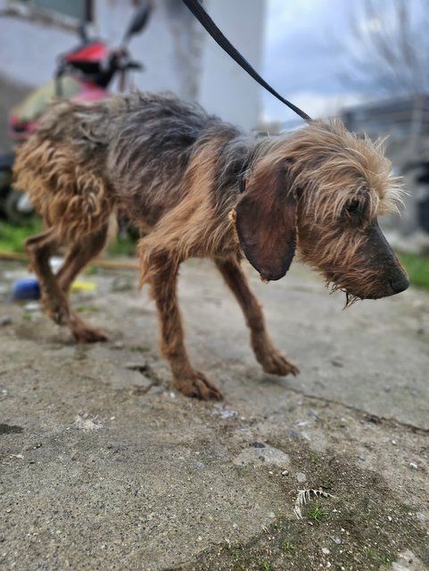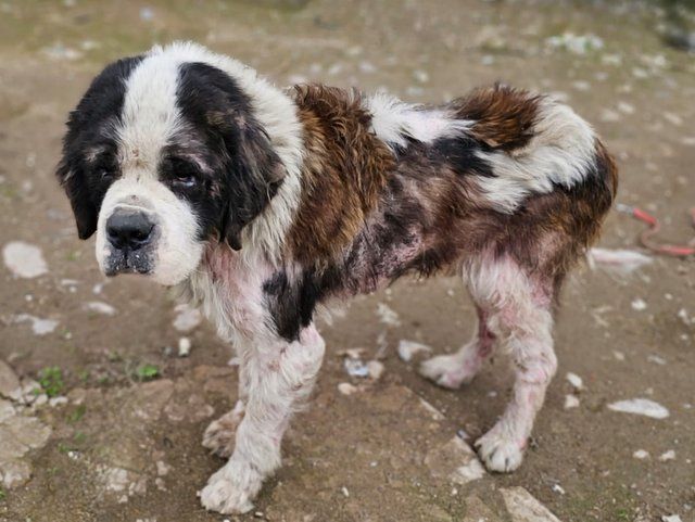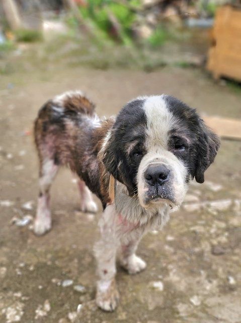 Barni wurde vom Besitzer beim Tierarzt abgeliefert und es stellte sich heraus, dass Barni nur die Demodex Milbe hat, blutarm ist und unterernährt.