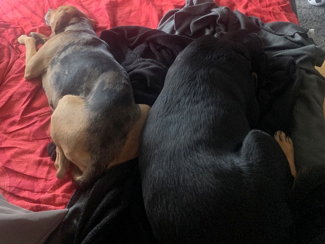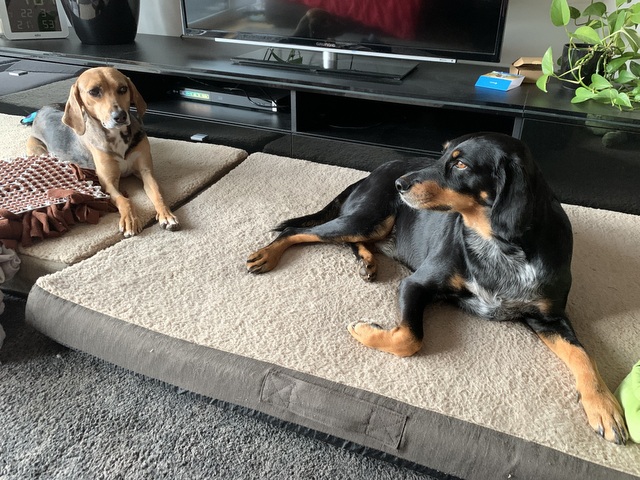 Das Zusammenleben mit Jack (schwarzer Mischlingshund, wurde im Jahr 2020 von mir von „Hundeliebe grenzenlos“ adoptiert) klappt auch sehr gut. Jack hat eine Engelsgeduld mit dem wilden Hüpfer, gibt sich sehr viel Mühe, er ist wirklich ein ganz besonderer Hund.
