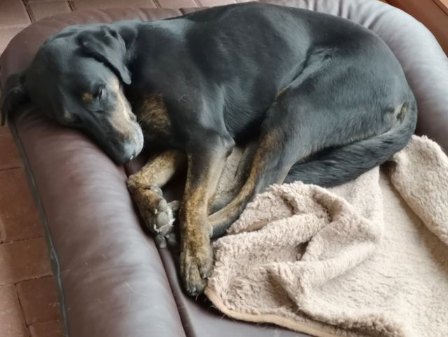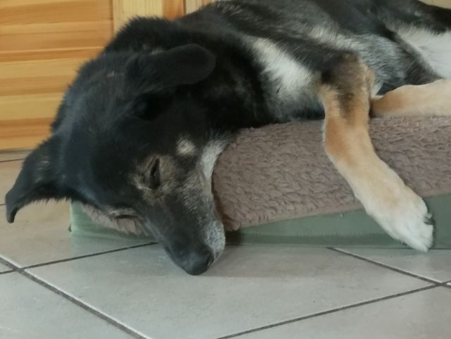 Iva, unsere alte Dame, hat sich mit jedem verlorenen Kilo verjüngt. Es ist so schön, zu sehen, wie sie begeistert beim Gassi gehen schnüffelt und die Gegend erkundet. Zwischendurch kommt das Köpfchen hoch und sie schaut, wo ich bin. Ob beginnende Schwerhörigkeit oder Altersstarrsinn die Ursache ist, daß sie nicht so gut hört/gehorcht, weiß ich nicht. Aber damit kann ich leben. Ich zeige ihr auch gern, was ich meine. Meistens klappt dann alles, wie es soll. Sie ist zauberhaft, liebt unseren Merlin (der aber nicht nur ihre Nähe nicht so gern mag) und freut sich über Streicheleinheiten, lecker Futter und ein kuscheliges Plätzchen. Madame weiß aber auch, was sie will. Das zeigt sie meist still und unauffällig, manchmal aber auch mit einer gewissen Penetranz. Wenn ich an ihre Vergangenheit denke, geht mir jedes mal das Herz auf, wenn sie mit mir durch die Gegend läuft oder tiefenentspannt auf ihrem Kissen (oder mitten im Weg) liegt. Das schöne Gefühl, beiden ein Leben geschenkt zu haben, überwiegt eindeutig die Mühen, die damit verbunden waren und noch sind.