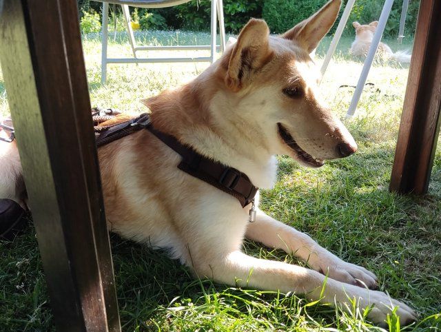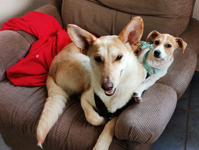 Ihren "Hundekumpel" aus der Shelter in Zypern, Lemone, sieht sie nun öfters und die zwei toben und rennen um die Wette durch die Gärten und mögen sich sehr!