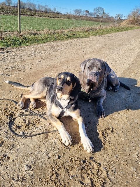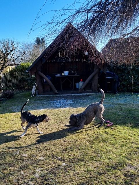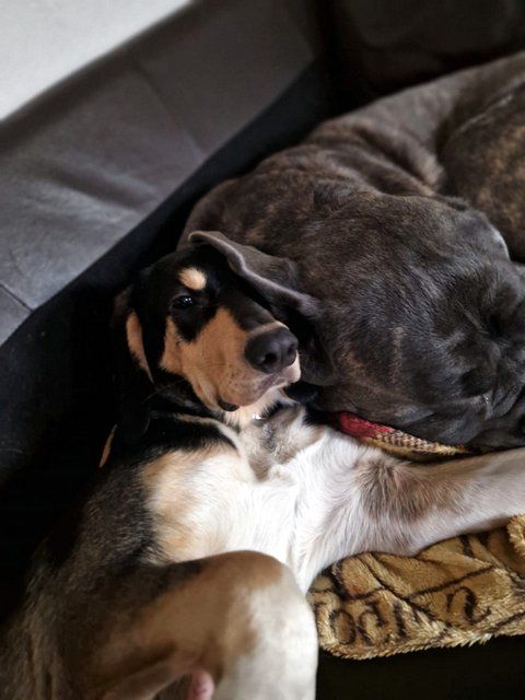 Anfangs war Hilde etwas ängstlich und schüchtern, da hat unsere andere Hündin Bella sie "an die Hand genommen " und zeigt ihr die große Welt. Die Zwei sind ein Herz und eine Seele. Spielen zusammen, teilen sich Bett, Futter & Spielzeug. In der Hundeschule lernt Hilde das Hunde 1x1 und lernt noch mehr Freunde kennen.