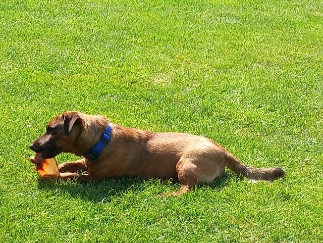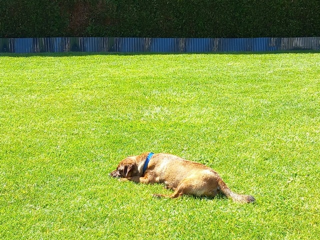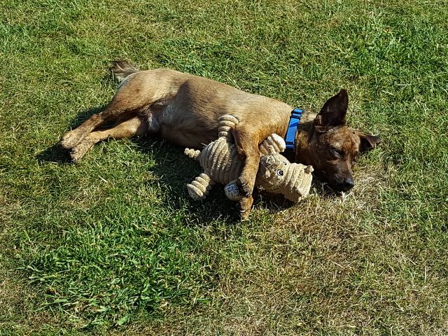 Dann fing mein Papa an, mit mir Kommandos zu üben. Ich muss gehorchen, dann gibt es ein Leckerli! Cool! Mit meiner lieben Mama ging ich dann oft, außerhalb des Dorfes in die angrenzenden Feldwege. Auch superinteressant, dort kann man sehr viel schnuppern und sehen. Dann hatten meine Herrchen schon Termine beim Tierarzt und bei der Hundeschule gemacht. Die Tierärztin hat mich untersucht und alles okay befunden. WAS AUCH SONST!!!!!!! Die Lehrerin begutachtete mich in einer Einzelstunde und stellte fest: Ich bin wesensfest, nicht aggressiv und selbstbewusst. WAS AUCH SONST!!!!!! O-ton Lehrerin: Ich lerne schnell aber ich mich muss daran gewöhnen, dass jetzt nicht ich sondern meine Menschen die Entscheidungen treffen. Danach wurde ich gleich in die Hundeschule aufgenommen. Nach zwei Schulstunden gelte ich als Streber ;-)) Inzwischen darf ich schon ohne Leine in den Garten und liebe es in der Sonne auf dem Rasen zu liegen. Das kann ich stundenlang aushalten!
