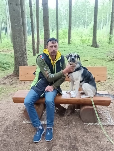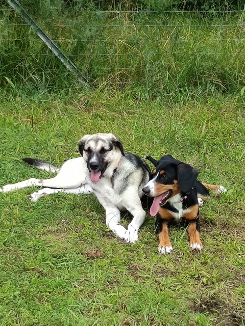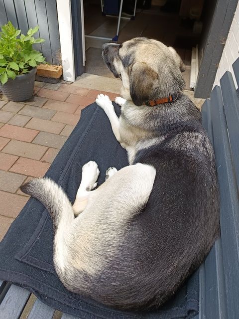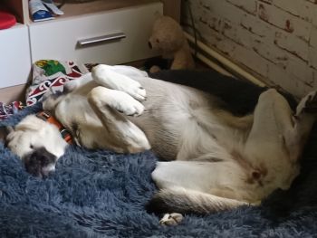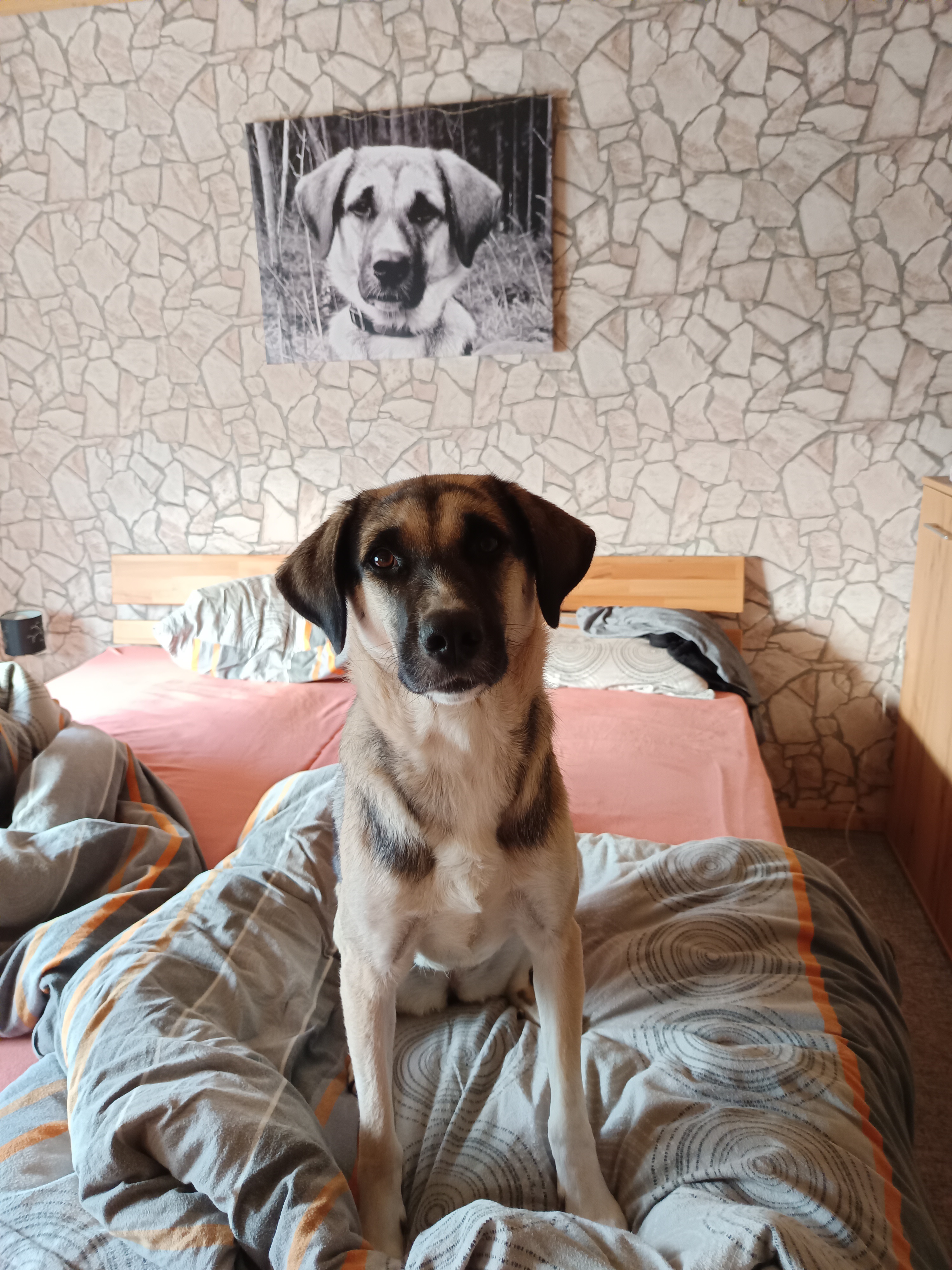 "Ich habe mich super eingelebt. Meine neuen Eltern knuddeln ganz viel mit mir. Ich darf nachts im Bett mit schlafen wenn ich mag oder ich kuschel mich in mein weiches Körbchen das direkt neben dem Ofen liegt damit ich es immer schon kuschelig warm habe. Wir machen ganz lange Waldspaziergänge, fahren mit dem Fahrrad und besuchen die Hundewiese. Ich hab auch schon eine Freundin gefunden mit der ich mich regelmäßig zum Toben und spielen treffe. Im Sommer durfe ich in unserem Garten buddeln und Frauchen bei der Gartenarbeit helfen. Wir waren auch im Urlaub. Haben am Strand gespielt und das Wasser genossen.