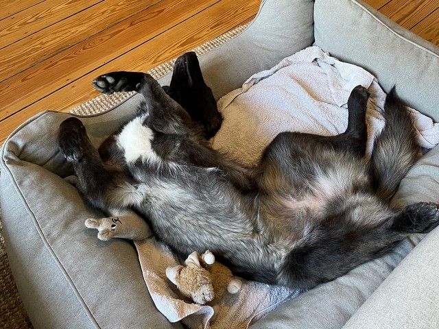 Sie hat sich von Anfang an bei uns Zuhause wohl gefühlt und war mit Alltagsgeräuschen wie Nachbarn, Staubsaugern etc. ganz entspannt. Quasi ein wahres Naturtalent! Sie schläft gerne lange aus (was super zu uns passt) und auch tagsüber liegt sie gerne ruhig dösend in einer gemütlichen Ecke. Wenn es dann aber raus geht, ist sie voll dabei! Sie liebt es zu rennen, zu springen und tolle neue Tricks zu üben. Sie ist immer mit dabei: An 1-2 Tagen die Woche begleitet sie Julika problemlos ins Büro und fährt sogar ganz entspannt mit der U-Bahn dorthin. Im Büro hat Kaja mittlerweile viele Fans und dort lässt sich natürlich auch das ein oder andere Leckerli abstauben. Aber auch die anderen Tage, an denen Herrchen oder Frauchen im Home Office sind, sind natürlich richtig toll! Besonders, weil in den Arbeitspausen ganz viel gekuschelt wird…