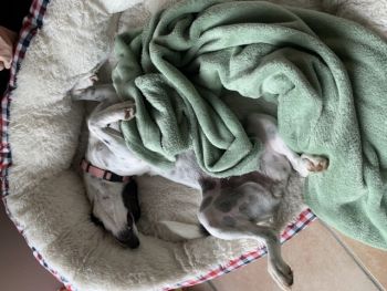 Sie genießt die Ruhe zwischen den Spaziergängen und ist eine leidenschaftliche Mäusejägerin.