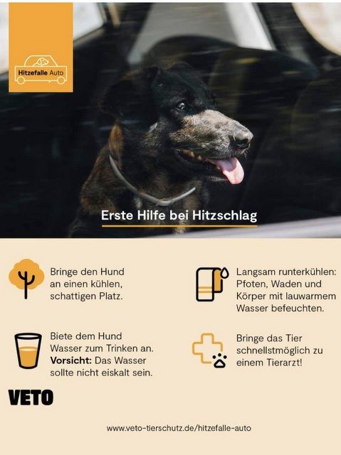 Ist der Hund aus einem heißen Auto gerettet, muss er schnell in den Schatten und Wasser trinken. Sein Körper sollte mit handwarmem oder leicht kühlem Wasser befeuchtet werden. Auch das dringend notwendige Trinkwasser sollte diese Temperatur haben.