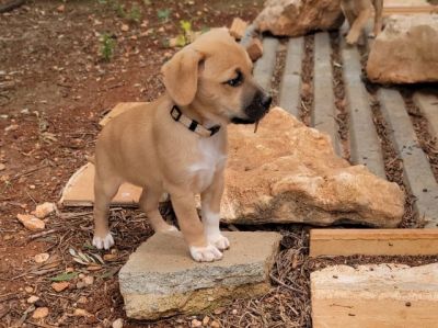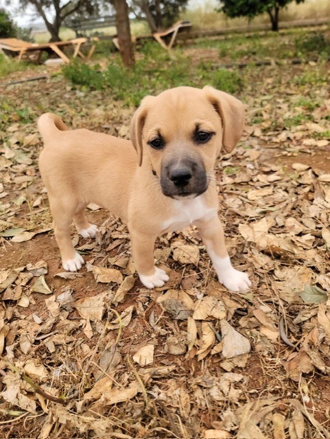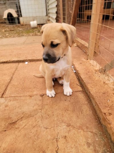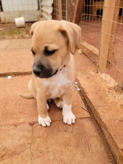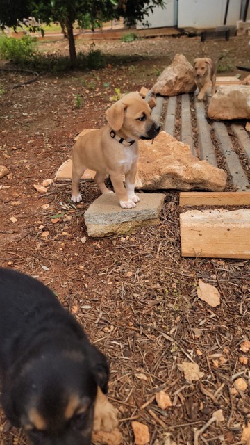 Die Mama von Feta hat eine Schulterhöhe von 45 cm. Somit werden wohl auch die Welpen mittelgroß werden. Papa unbekannt.