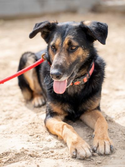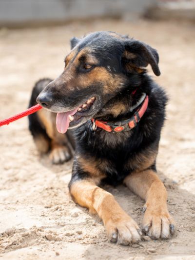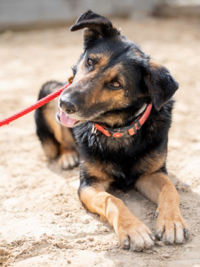 Dieser hübsche junge Rüde ist ein ruhiger, sanftmütiger Zeitgenosse, der ein geduldiges, verständnisvolles Zuhause für immer sucht, damit er sich entfalten kann. Jet hat ein auffälliges schwarzes und braunes Fell mit schönen Sprenklern wie Pfeffermuster auf seinem ganzen Körper, was ihm ein robustes und doch auffälliges Aussehen verleiht. Seine großen, ausdrucksstarken Ohren stehen aufrecht und wachsam, sie umrahmen sein Gesicht mit den warmen braunen Augen, die eine nachdenkliche und beobachtende Seele verraten. Von Natur aus ist er anfangs etwas zurückhaltend gegenüber fremden Menschen; es kann eine Weile dauern, bis er sich eingewöhnt hat und er beobachtet erst still, bevor er sich nähert. Sobald er jedoch jemandem vertraut, ist er zuneigungsvoll und geniesst es, sich sanft den Kopf streicheln zu lassen und eine ruhige Gesellschaft zu haben. Für sein Alter ist er insgesamt sehr ruhig, nicht hyperaktiv oder umherspringend.