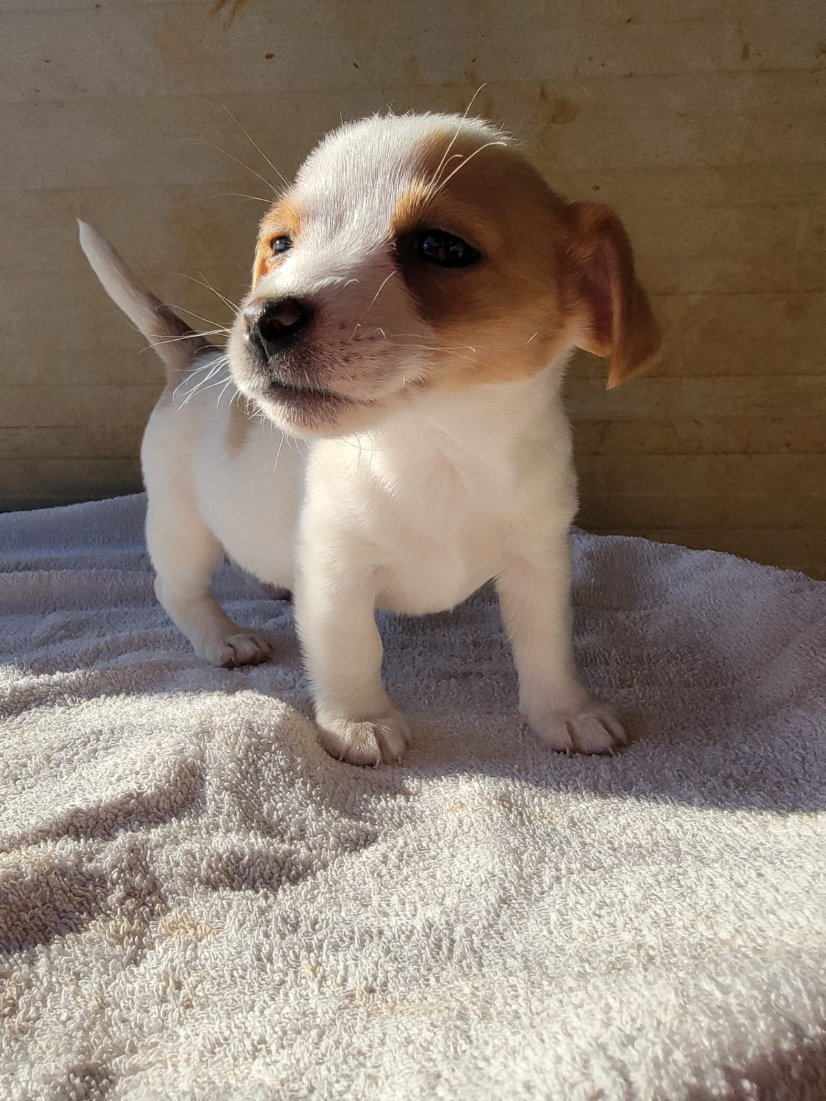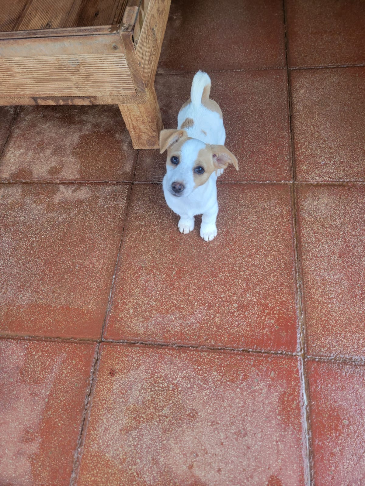 Mango wurde im Dezember zusammen mit ihren drei Geschwistern ausgesetzt und musste mit der Flasche großgezogen werden, da keine Mutter vorhanden war. Sie ist ein winziges Welpen-Mädchen mit glattem, weiß‑braunen Fell und einer tanfarbenen Maske über einem Auge und Ohr, was ihr besonderen Charme verleiht. Ihre großen, ausdrucksstarken Augen verleihen ihr einen sanften, neugierigen Blick.