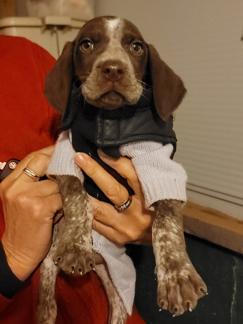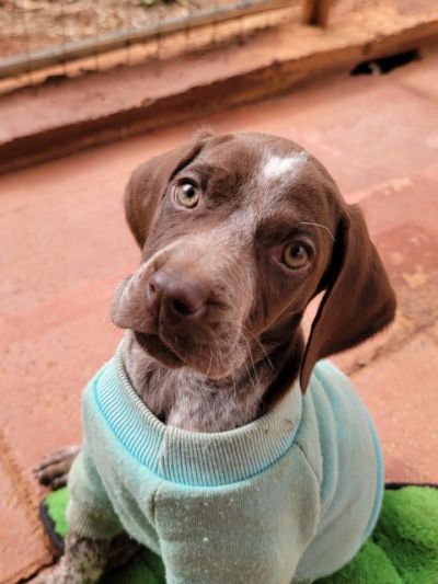 Mateo ist unseres Erachtens nach ein reinrassiger Deutsch Kurzhaar Pointer Welpe, der selbst in diesem jungen Alter bereits seine charakteristische Eleganz und athletische Figur zu zeigen vermag. Sein Fell ist ein sattes Schokoladenbraun mit einer Aufsehen erregenden weißen Blesse in der Mitte seiner Stirn, die ihm ein besonders aussdrucksstarkes Gesicht verleiht. Seine großen seelenvollen braunen Augen und seine weichen, hängenden Ohren machen ihn absolut unwiderstehlich. Er hat diesen süßen, neugierigen Welpenblick, der Herzen zum Schmelzen bringt. Was an diesem kleinen Kerlchen am meisten auffällt, ist seine liebevolle, zärtliche und überraschend entspannte Persönlichkeit. Er liebt es, bekuschelt zu werden, ist gut anpassungsfähig und zeigt ein liebevolles, ausgeglichenes Wesen, das perfekt für Familien ist. die einen treuen Begleiter suchen. Als Tierschutzhund hat er bereits einen schwierigen Start in seinem kurzen Leben hinter sich, reagiert aber wunderbar auf Freundlichkeit und Fürsorge.