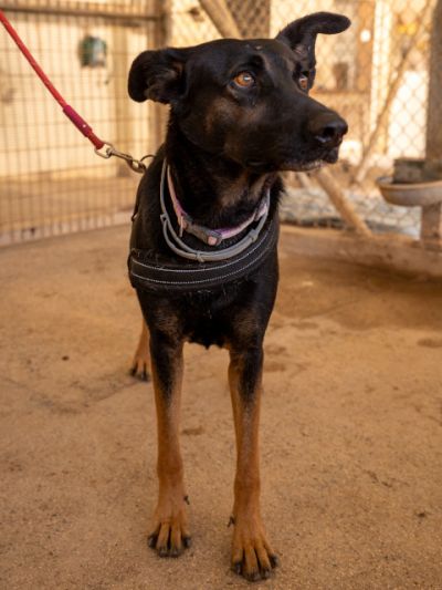 Lady ist ein ruhiger Hund, bellt nicht und ist sehr ängstlich. Wenn jemand, der ihr nicht geheuer ist, ihren Zwinger betritt, reagiert sie sofort und rennt nach draußen in Auslauf. Wenn man ihr folgt, rennt sie zurück in ihren Zwinger und setzt sich in ihr Bett. Dort kann man sie leicht streicheln, ihr das Geschirr anlegen und sie geht bereitwillig spazieren und läuft gut an der Leine. Sie ist schwarz-hellbraun und hat spitze, große Ohren.