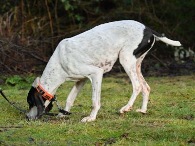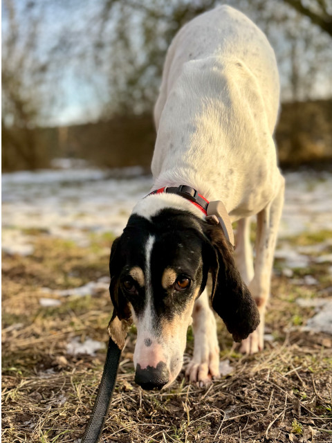 Draußen zeigt er sich offen und neugierig. Die Spaziergänge an der Leine, im gesicherten Garten, meistert er bereits mit Bravour. An der Orientierung und Ansprechbarkeit wird regelmäßig mit ihm gearbeitet. Er schaut sich alles ganz genau an und ist mit der Nase sehr aktiv. Futterbeutelsuche / Dummy / Mantrailing könnte ihm bestimmt viel Spaß machen.