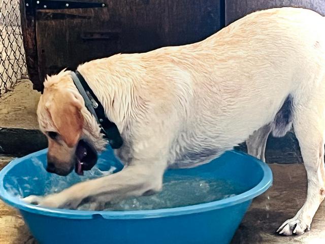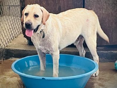 Achilles ist ein goldener Labrador, der sehr verspielt ist, viel Energie hat und immer noch denkt, er sei ein Welpe. Er braucht gerne Beschäftigung und wenn man ihn stundenlang alleine lässt, spielt er mit seinen großen Plastiknäpfen, die mit mit Wasser gefüllt sind, damit er spielen kann, dabei zerbricht er sie oft. Er ist sehr menschenfreundlich und hat kein Interesse an Katzen. Er geht gut an der Leine und hat einen sanften Charakter.