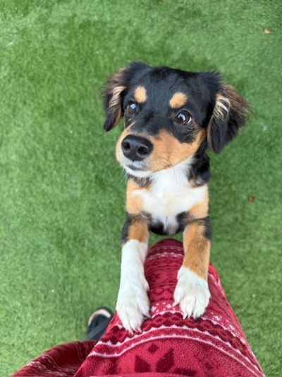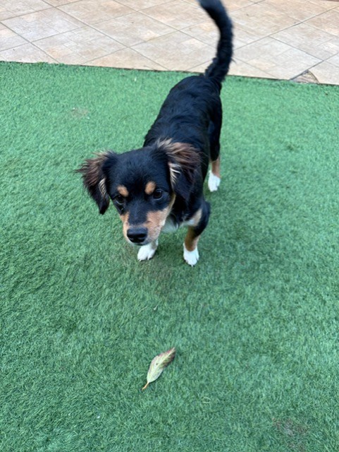 Athena ist eine kleine, zart gebaute Mischlingshündin mit wunderschönem schwarzen Fell mit warmen tanfarbenen Abzeichen im Gesicht und an den Beinen sowie weißen Pfötchen. Ihre großen, sanften Augen und die flauschige Rute, die fast immer wedelt, machen sie zu einer besonders liebenswerten jungen Hündin.