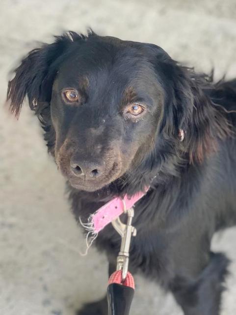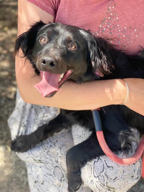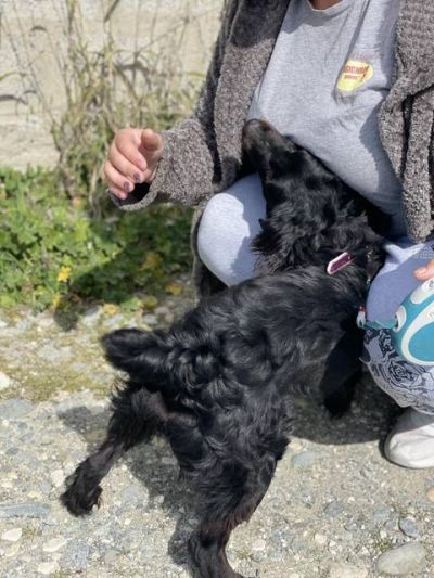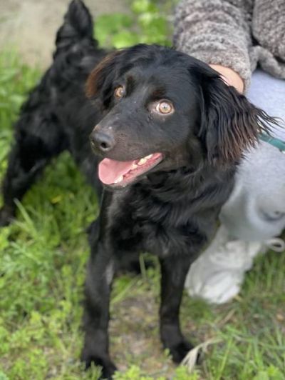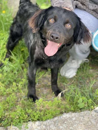 Boomer hat sehr viel von einem Spaniel. Er hat eine kurze Rute und ein sehr schönes welliges Haarkleid. Auf den Fotos ist er noch ziemlich schmutzig.