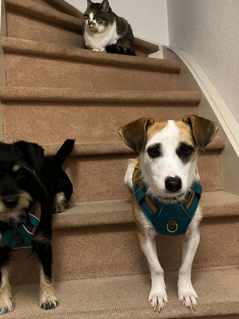 Dodi kennt inzwischen ihren Namen, nimmt Blickkontakt auf und zeigt eine schöne Leinenführigkeit. Zuhause zieht sie sich eigenständig in ihre Transportbox zurück und kann gut entspannen. Mit dem Stubenreinsein ist sie auf einem guten Weg – manchmal vergisst sie draußen vor lauter Aufregung ihr Geschäft, aber auch das entwickelt sich weiter.